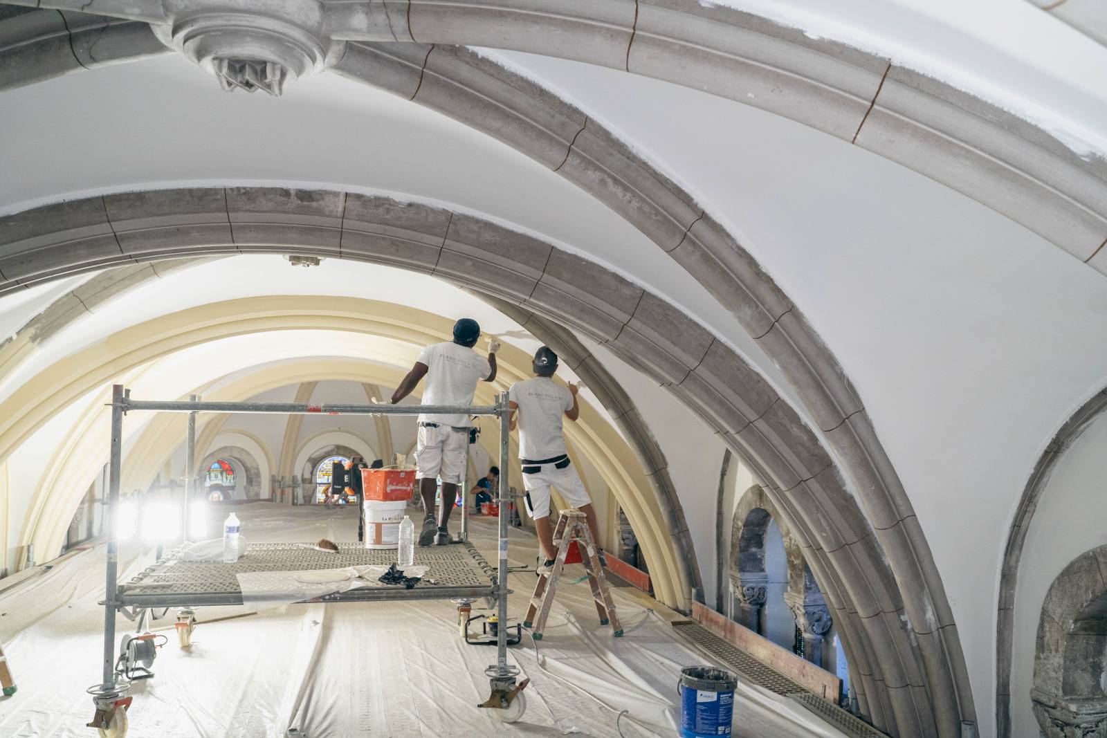 Pour commencer, un échafaudage imposant a été installé afin d'atteindre les 20 mètres de hauteur. Après cela, un nettoyage minutieux a été effectué, éliminant plus de 100 ans de poussières accumulées. Nous avons ensuite procédé à des reprises partielles d'enduit et au colmatage des pierres pour restaurer la structure. Une fois ces étapes terminées, nous avons pu passer à la phase de finitions.